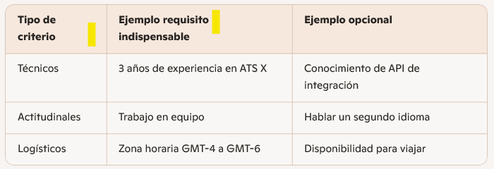 - Criterios técnicos: competencias, certificaciones, nivel de experiencia y herramientas dominadas.